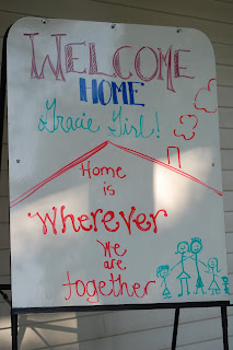 On Saturday we packed up everything from the mission house in Crozet and drove back to the other house we’ve been using in Locust Grove. As Colby hunts for jobs, the reality is we will be moving again some time in the next year. Among other things, riding the rollercoaster that is called our life these past two years has truly bonded our nuclear family. I decided to make a welcome home sign for Gracie that would make sense to her and to us…